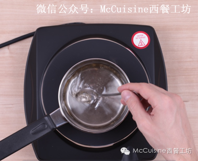 7. 加热小锅,不断搅拌,直到糖溶解,搬离电磁炉。不要过分煮!!