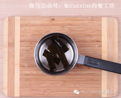 8. 在搬离电磁炉的小锅内加入昆布,让他和糖盐醋一起慢慢冷却。