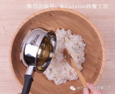 9. 去一个木制碗,放入米饭,放入煮好的寿司醋,用木铲轻轻的不断的搅拌。