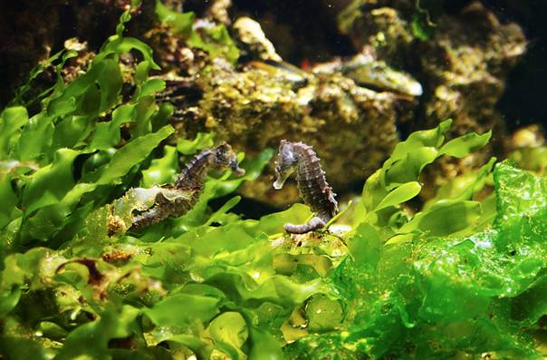 北部条纹海马生活在苦草eel grass (Zostera marina)当中,但这种海草在水族箱内很难生长。因此我尽量减少活石,利用空间饲养管状绿藻,(Caulerpa prolifera)蕨藻的一种,它是一种在水族箱内生长非常好的巨藻。使用两盏150瓦的金卤灯就能保证它们生长良好。海藻不仅为海马提供良好的栖息生存空间,同时也为微小动物提供栖息繁殖地。虽然不能成为主食,但它们是海马最爱吃的小点心。另外,海藻森林的自然效果还能促使海马提高产卵频率。