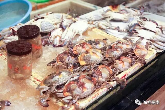 “这种一只重三两多的红膏蟹,壳挖开的卖四十元一斤,现在一斤多重的活蟹要五十元,过几天就要卖一百多元了。”另一头活鲜摊位的老板介绍,海鲜价格因鱼货量、新鲜度等不同因素,一天一个价。