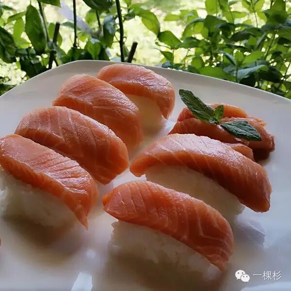 放上切好的三文鱼,OK啦!如果有切剩的小块鱼,直接刺身吧。