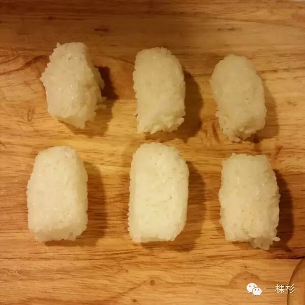 米饭凉到比室温稍热。用手把米饭握成型。饭团要紧到筷子能夹起来。在饭团的一面抹一点山葵。