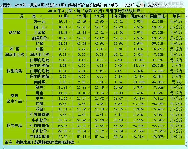 家禽产品市场上,根据慧通数据研究部初统数据显示,2016年第13周全国商品鸡蛋周度均价6.36元/公斤,环比上涨1.95%,同比下跌5.47%;淘汰蛋鸡周度均价9.52元/公斤,环比上涨2.03%,同比下跌7.65%。出栏白羽肉毛鸡出场周度批发均价8.03元/公斤,环比下跌4.61%,同比上涨0.63%;白羽肉鸡苗出场周度均价3.54元/羽,环比下跌12.14%,同比上涨69.61%;白羽肉毛鸭出场批发周度均价7.19元/公斤,环比上涨4.02%,同比下跌6.33%;白羽肉鸭苗出场批发周度均价3.41元/羽,环比下跌3.47%,同比上涨6.48%;肉种蛋市场周度价格1.94元/枚,环比下跌24.96%;同比上涨44.96%。