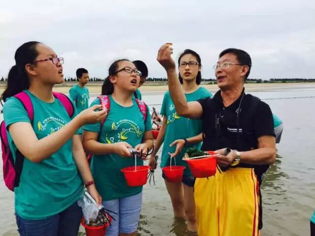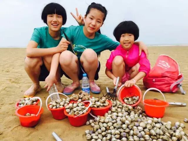 午饭后,雨适时地停了下来,下午的赶海活动得以顺利进行。上午放流牙鲆鱼苗的海岸已经因为退潮露出了一大块潮湿的海滩。孩子们手拿小红桶和小工具,兴奋地开始了他们的“狩猎”。