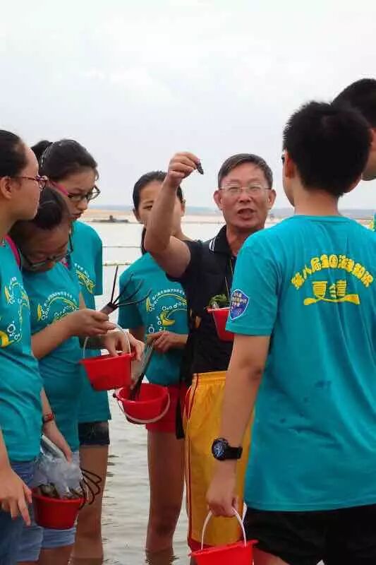 厦门科技大学的带队老师给营员们讲解打捞上来的各种奇怪的海洋生物,同学们听得津津有味。