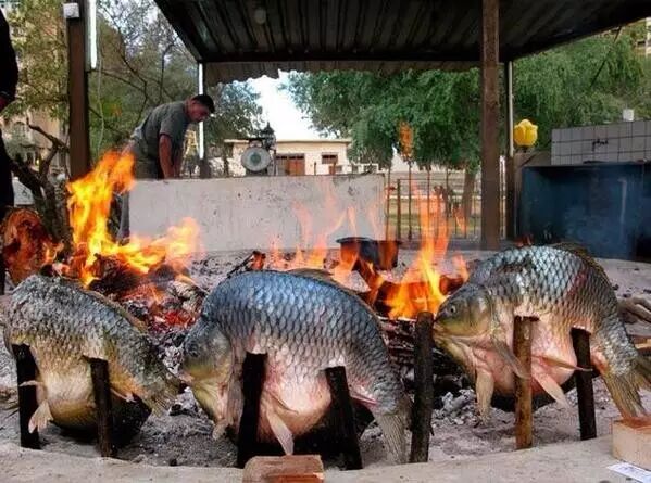 看到这里有网友或许会吐槽,什么?连淡水鱼居然都能当特产拿出来讲?的确,要放在国内,吃个淡水鱼实在是太Easy啦,可你曾知道整个中东世界,只有伊拉克有淡水湖,也只有伊拉克能出产个淡水鱼,大部分中东人民一辈子都只能吃到海鱼,淡水鱼之于阿拉伯人可是高级食材。迪拜有不少伊拉克餐厅,其招牌就是伊拉克烤鱼,用的就是伊拉克才有的淡水鱼Maskouf,都是从伊拉克空运过来。这种鱼体形肥大,油脂非常丰富,最小的都有2公斤起,用原始粗暴的方式烤制,一条鱼往往就够好几个人吃饱了。
