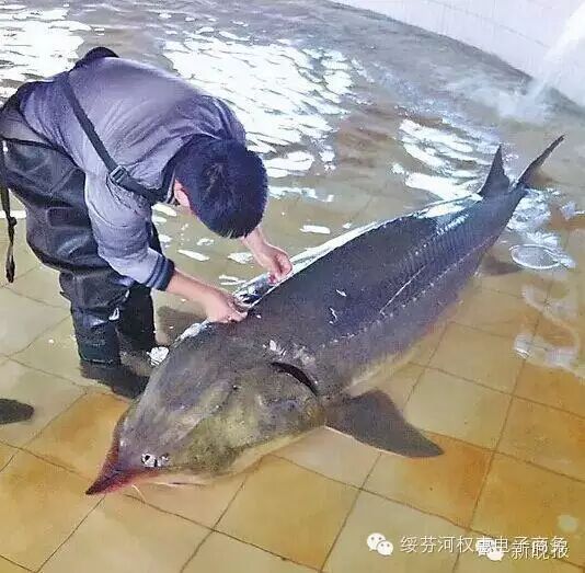 图中这条大鳇鱼体长6.68米 最大胸径0.8米,重978斤