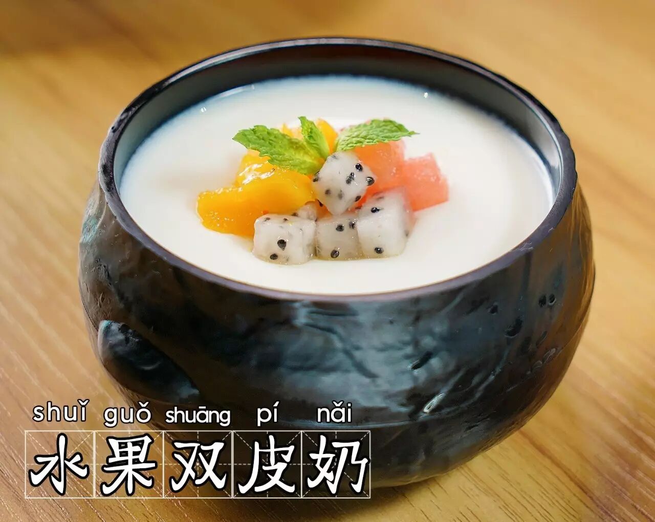 双皮奶上铺上一层新鲜的水果,让水果和浓郁的奶香相互碰撞在一起,感觉吃多少都不会腻~