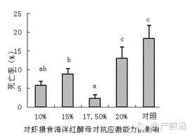 摄食海洋红酵母的南美白对虾对外界环境的抗应激能力显著提高,成活率显著高于对照组。