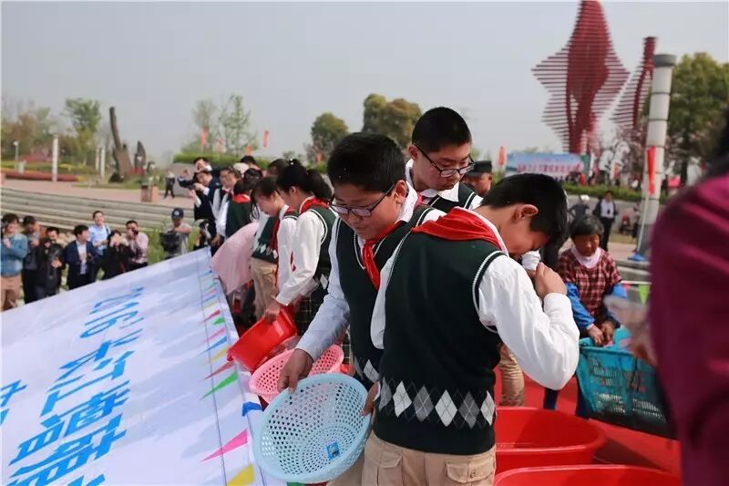 活动现场,满载着鱼苗的卡车在园博园风帆广场边依次排开,放流台临水搭建,渔业工作人员、青年志愿者、学生、市民代表们每人端着一只水盆排队领取鱼苗,走近放流台,将一尾尾鱼苗缓缓放入长江,让它们回到母亲河的怀抱。
