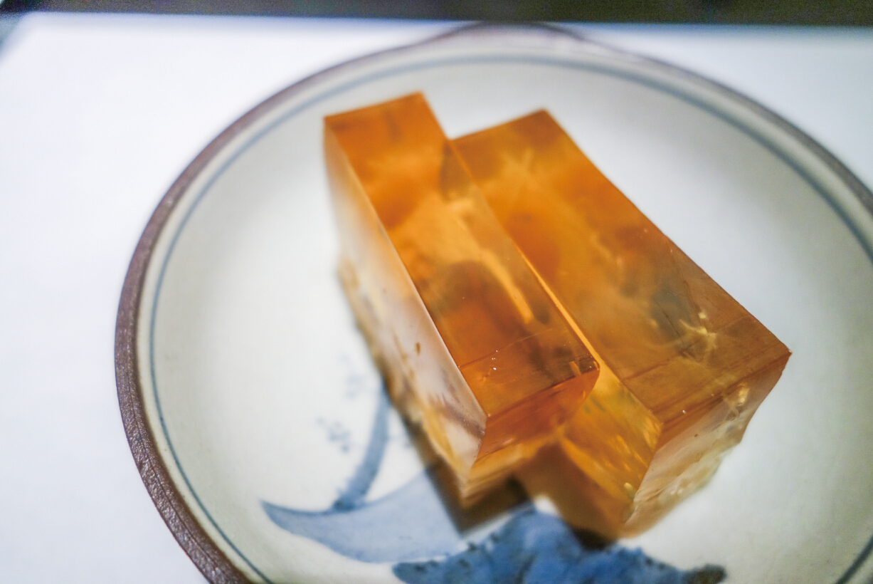 野生河豚和其他河豚有什么区别?光从刺身的颜色上就能看出来。博多い津み的老板娘告诉我,上好的野生河豚刺身会带着特有的粉红色;如果是用野生河豚的鱼苗人工蓄养长大的河豚,刺身会呈象牙色;而我们常见的人工养殖的河豚,刺身会显偏灰色。我起初以为呈粉红色是由于残留着河豚血,一问,老板娘连忙摆手说这太危险,店里厨师会反复清洗,去除河豚血的毒素,以确保食客的安全。