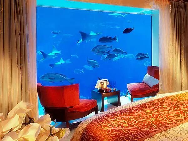 而更有趣的是,可以在房间里边洗澡边看鱼!酒店里设有“失落的空间”套房,其中一面墙是巨大的玻璃,与水族馆相连,水族馆里的鱼会不时从眼前经过,包括鲨鱼。想像着一边在浴盆里泡澡,一边享受与奇形怪状的海洋动物注视的那种奇特感觉;或者干脆放心大胆地和凶残的鲨鱼面对面地数着它的牙齿安然入睡。