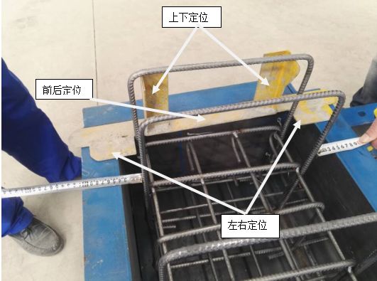 通过钢筋笼定位装置将钢筋骨架定位在一个固定位置,预制过程中钢筋骨架不位移,确保保护层厚度,构件外观质量也能得到保证,同时提高遮板混凝土的耐久性能。