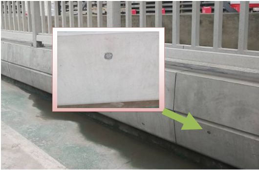 通过遮板安装卡具左右卡槽在安装过程中将遮板均匀固定到梁相关位置,同时设置防碰撞胶垫,防止遮板安装过程中因为碰撞损坏棱角。遮板之间板缝均匀(4mm),遮板安装调整质量容易控制,操作方便,提高工效。同时确保后期栏杆安装位置尺寸准确、线型美观。