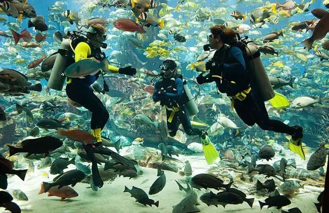 据说,这些庞大的鱼群背后是一个超过165名全职海洋生物专家组成的管理团队。团队全天候地紧密监察亚特兰蒂斯度假酒店的生态系统。而他们还有一个称谓,就是“导航员”———带领感兴趣的游客探秘海洋世界背后的秘密。很难想像这个庞大水族馆的幕后操控室竟然是可以“公之于众”的。如何进行沙过滤、如何照顾生病的鱼儿,甚至是亲手体验一次喂饲海洋生物的滋味……这个水族馆,这个海洋世界还真是乐趣多。