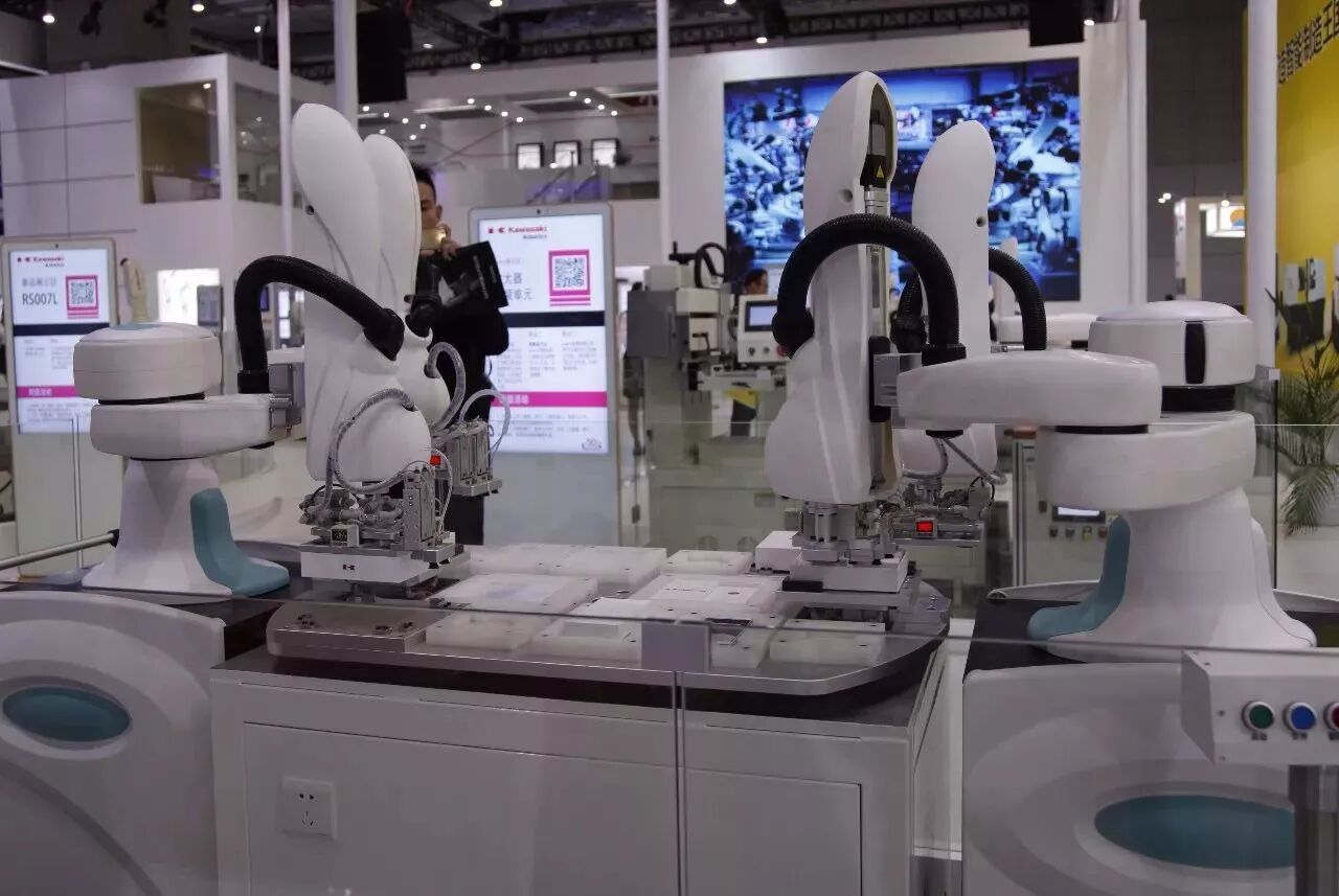 川崎(Kawasaki)在本次工博会上展出了duAro双臂机器人。它具备高精度作业、人机协同作业、双手臂协同作业三个特点。duAro双臂机器人的重复定位精度为±0.5mm,能保证包装盒的装配精确无误;它具有柔性机壳,发生碰撞时可自动停止,高密度流水线中可与人工共同作业;此外,duAro双臂机器人的两个手臂可单独执行作业,快速完成小部件的装配,同时也可双臂协同作业,共同完成大部件的装配作业。