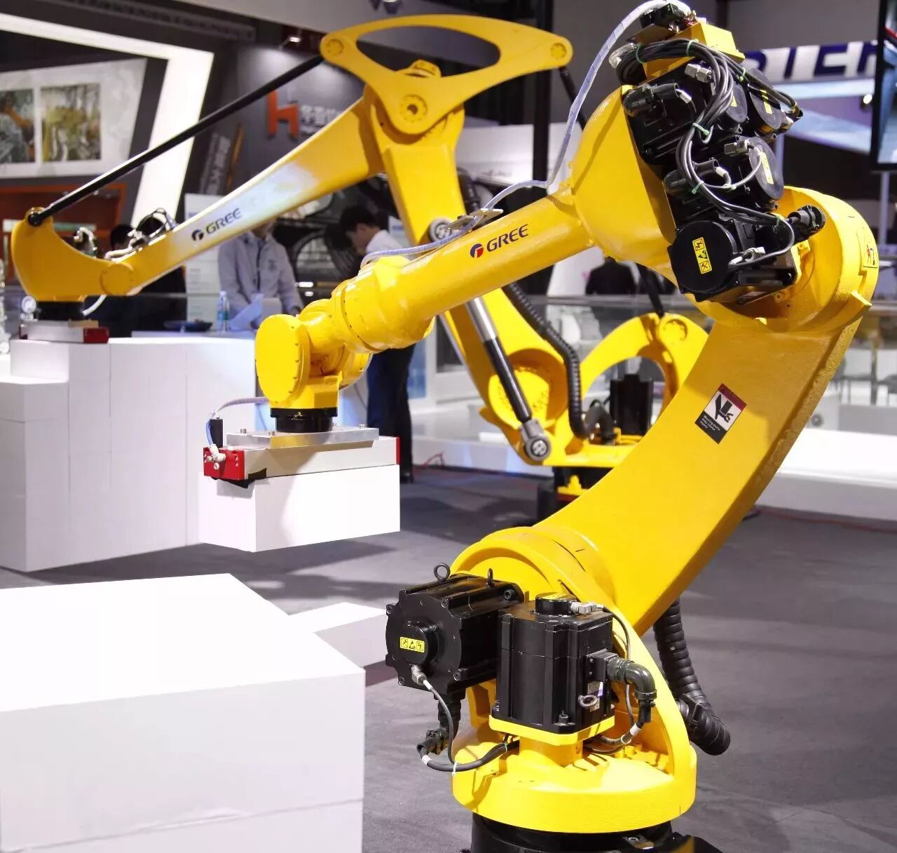 珠海格力电器股份有限公司此次展出了金字塔GR4180/GR6165/GR650工业机器人。这款机器人是由3台大负载机型机器人通过信号串接,实现联合码垛功能。它的高通用性可兼容不同规格尺寸纸箱,可完成多种垛型,实现智能化码垛。