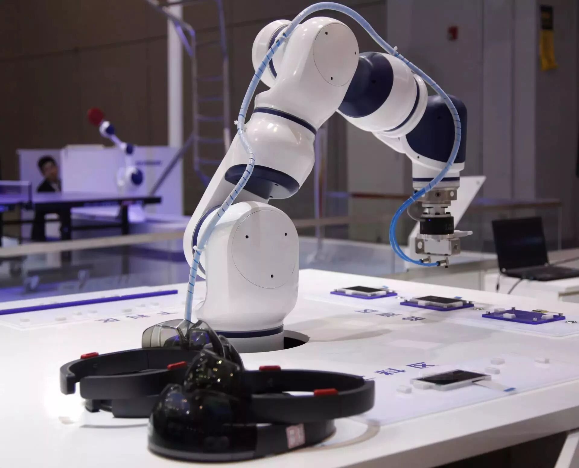 展会现场,新松协作机器人家族与AR增强现实技术携手打造人机共融,协作生产场景,将科幻变为现实。AR远程协助系统以AR技术选取指尖陀螺样式,通过人与柔性协作机器人、轻载复合机器人、双臂柔性机器人以及周边系统集成共同工作,定制私人专属个性设备,一气呵成,灵活、精准、安全、流畅完成指尖陀螺从选料、生产到配送的智能柔性生产全流程。