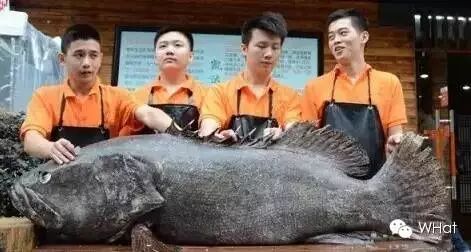 ▲ 这条深海石斑鱼,早上七点半从专机下来,60斤重,四人合抱进厨房,然而光鱼头,师傅要锯上半个小时。