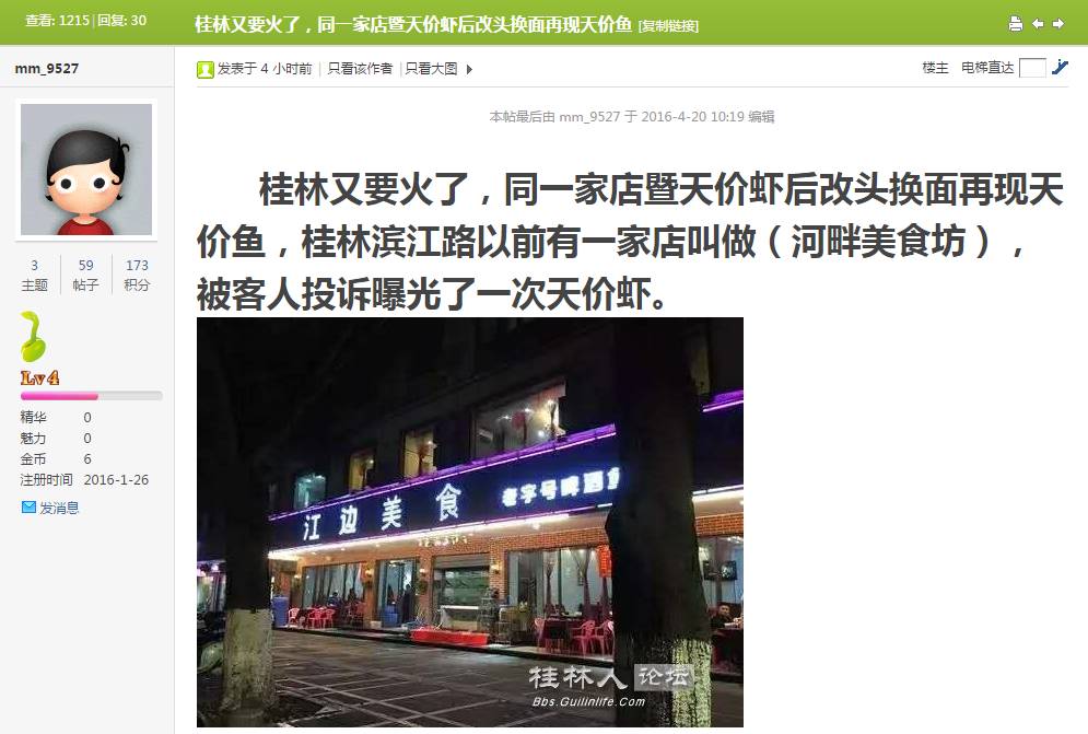 其实,桂林这家餐馆早已不是第一次销售“天价”菜品了!据网友@mm_9527 介绍,早在去年8月份,该餐馆就因为两荤一素收取餐费711元,被游客投诉到人民网,如今改头换面之后又被爆出“天价鱼”事件!