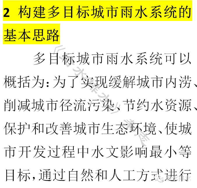的“渗、滞、蓄、净、用、排”等工程性措施与非工程性措施组合的城市雨水综合控制利用与管理系统,是城市水系统的重要子系统,也是城市基础设施建设的重要组成。多目标城市雨水系统的内涵与基本思路包括: