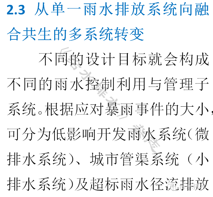系统(大排水系统)。根据控制原理,可将其分为水量控制系统和水质控制系统。根据其系统目标,又可分为排水防涝系统、径流污染控制系统、雨水集蓄回用系统、综合管理系统等。根据管理手段的不同,雨水系统可分为工程性措施和非工程性措施两类。具体城市、区域或项目的雨水控制利用系统方案制定时,一定要结合城市水资源和水环境特征,综合考虑多个子系统之间的关系和优先次序。这样才能使城市雨水控制利用系统作为水环境保障和生态保护的重大战略发挥作用。