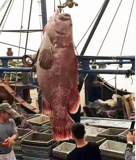 5日凌晨4点35分左右,汕头南澳县云澳镇渔民捕到一条重达175公斤的石斑鱼,需吊机才能吊起。