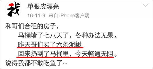 @心头撞鹿_:说真的,我家前几天马桶堵了,搜百度好几个网页都说泥鳅![[喵喵]]()
