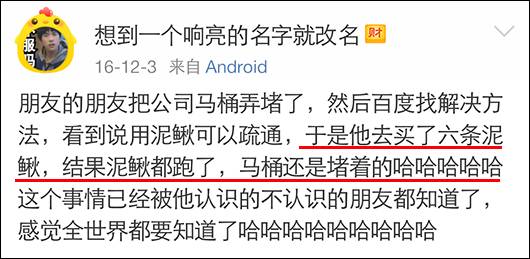 2014年11月27日,江苏常州网友“lifei7877171”发帖称,家中马桶出现了堵塞,他按照网上的方法把20块钱的泥鳅倒进马桶,又浇上一盆开水,本以为泥鳅遇热会往下水道钻。结果马桶没通,泥鳅全部烫死……