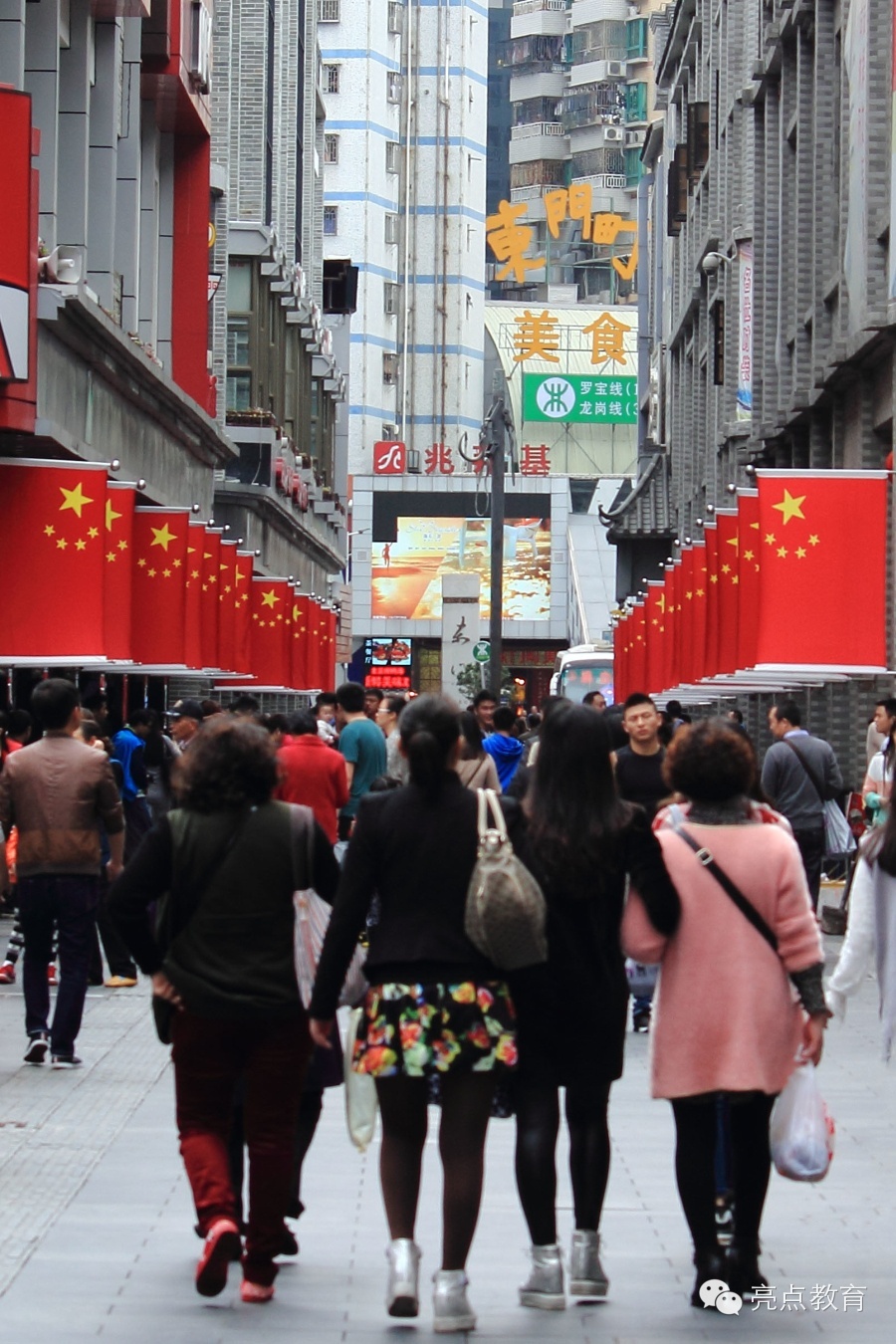 1—5 春节的深圳东门老街一带,国旗与红灯笼高挂,满街红火一片,喜气洋洋。