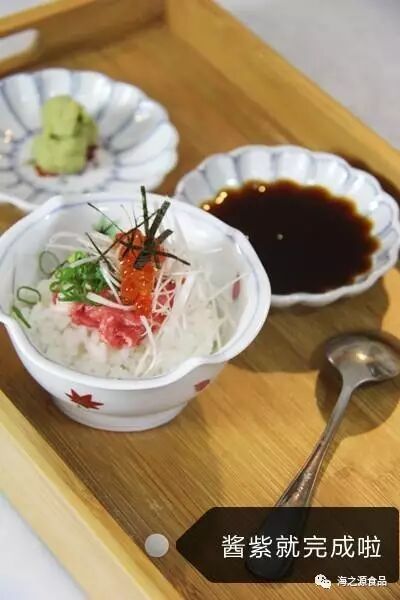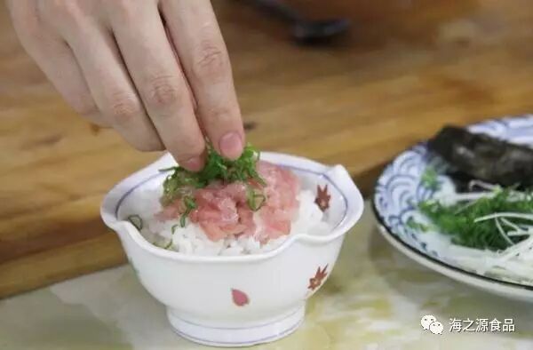 step3:米饭用小碗乘出,盖上金枪鱼、大葱、小葱、三文鱼子酱;