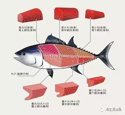大腹部位的鱼肉油脂丰厚,肉嫩呈粉红色,入口即化有油脂香,价格最贵;中腹在腹部和背部,含有适度的脂肪,肉口味次之,颜色稍深,价格比大腹部位的肉便宜;赤身是背部脂肪最少身体最硬,卡路里最低,蛋白质最高的部分,价格最低。