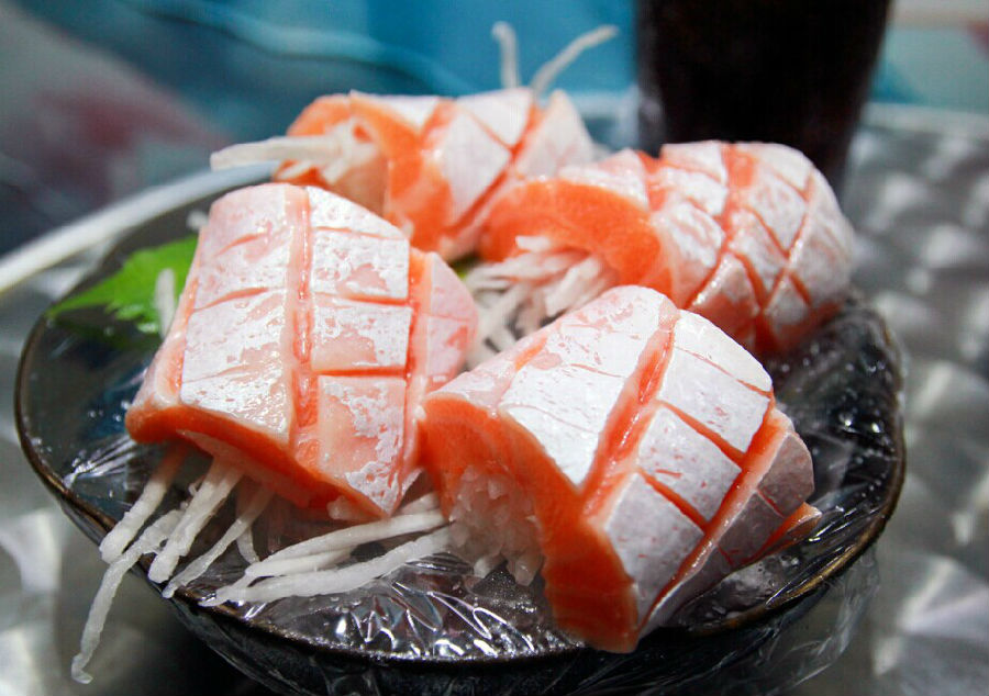 嚟尼噶客人,三文鱼腩系必点噶!因为尼度嘅三文鱼出咗名“厚”“大块”“抵食”!有几厚?睇图自己体会啦,其实我一直都怀疑尼度个师傅系唔识切三文鱼嘅。或者系个老世好大仇口噶,如果唔系无理由切到咁大块咁厚嘅,简直系业界良心啊!