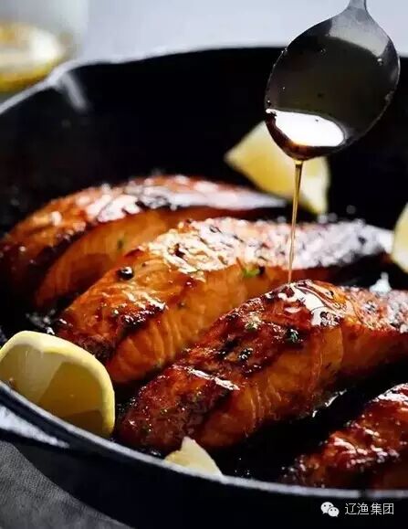 6、将烤好的三文鱼从烤箱拿出来,将熬制好的酱料倒在上面,再放入烤箱中烤4—5分钟