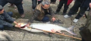 居民 陆先生:鱼有70多斤,一米三左右,那么老粗的身子,看着像鱼精,在江边好多人看,因为很多人都没见过那么大的鱼。