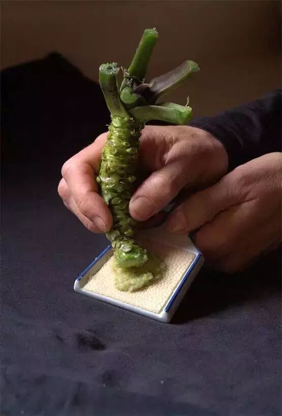 地道的日本生鱼片一定要配上地道的绿芥末,而地道的绿芥末来自一种叫做山葵(Wasabia japonica)的植物。山葵酱是由山葵的根状茎(看起来象是根,其实还是茎)经过研磨成细泥状制成的。山葵是一种原产日本的植物,生活在冷凉山区的溪边水畔,半水生条件下野生或栽培的山葵能研磨制成质量最好的山葵酱,但是价格不菲。虽然用大田栽培的山葵生产出来的山葵酱在质量上要差一些,但是由于栽培难,产量低,山葵酱的保鲜更不容易,所以,即使在日本,也只有在非常高档的寿司店里吃生鱼片时才能蘸到真正的山葵酱。