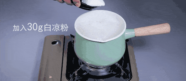 加入30克白凉粉,关火搅拌均匀,稍凉3分钟。