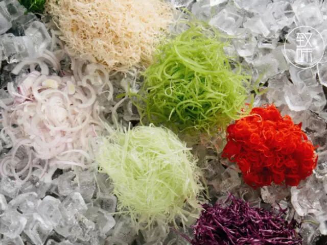 与日本刺身的芥末酱油不一样,顺德鱼生的另一精彩之处则体现在佐料上。酱油、香油、白糖、姜丝、蒜片、泡椒、葱丝、陈皮、芝麻、果仁。除了苦,完完全全做到酸、甜、辣、咸多方位的味蕾体验。特别推荐陈皮,绝对的亮点所在。只要一点点,瞬间提升口感,甜中带酸,回味无穷!