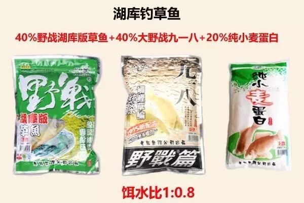 ①配饵比例为——40%野战湖库版草鱼+40%大野战九一八+20%纯小麦蛋白