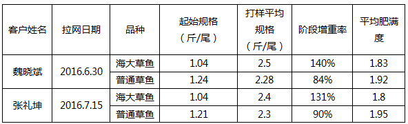 3、拉网打样结果:在6.30日和7.15日,分别对魏晓斌、张礼坤塘口拉网打样,并随机抽取海大草鱼和普通草鱼各20条进行对比。