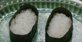 1.将做好的醋饭用手握成椭圆形,为防止沾手可在手上抹少许寿司醋。