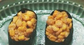 4.将煮熟的甜玉米粒与柔和型黄芥末酱(无蛋无奶)拌匀,装在寿司上方空缺处。