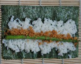 2.铺薄薄一层醋饭在紫菜上,在一边放上芦笋和素松。