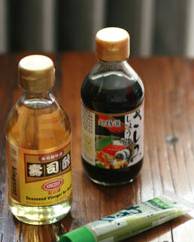 4.如果没有寿司醋可自己配。米醋,盐,糖的比例大概5:1:2。拌入米饭前将醋加热80度左右。