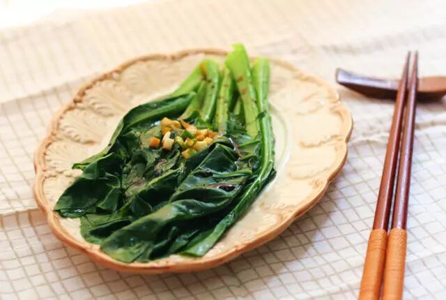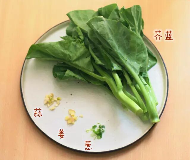 1. 葱姜蒜切末,将芥蓝较粗的茎从中间切开,便于煮熟4. 油烧热,浇在葱姜蒜末上,刺啦刺啦爆香