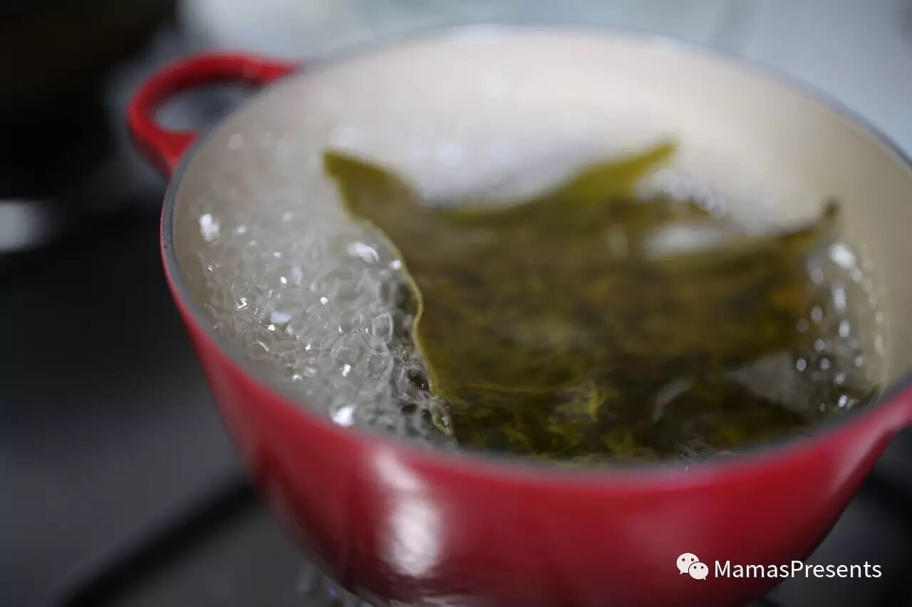 2、锅中入水,放一片昆布,烧开后转小火炖10分钟