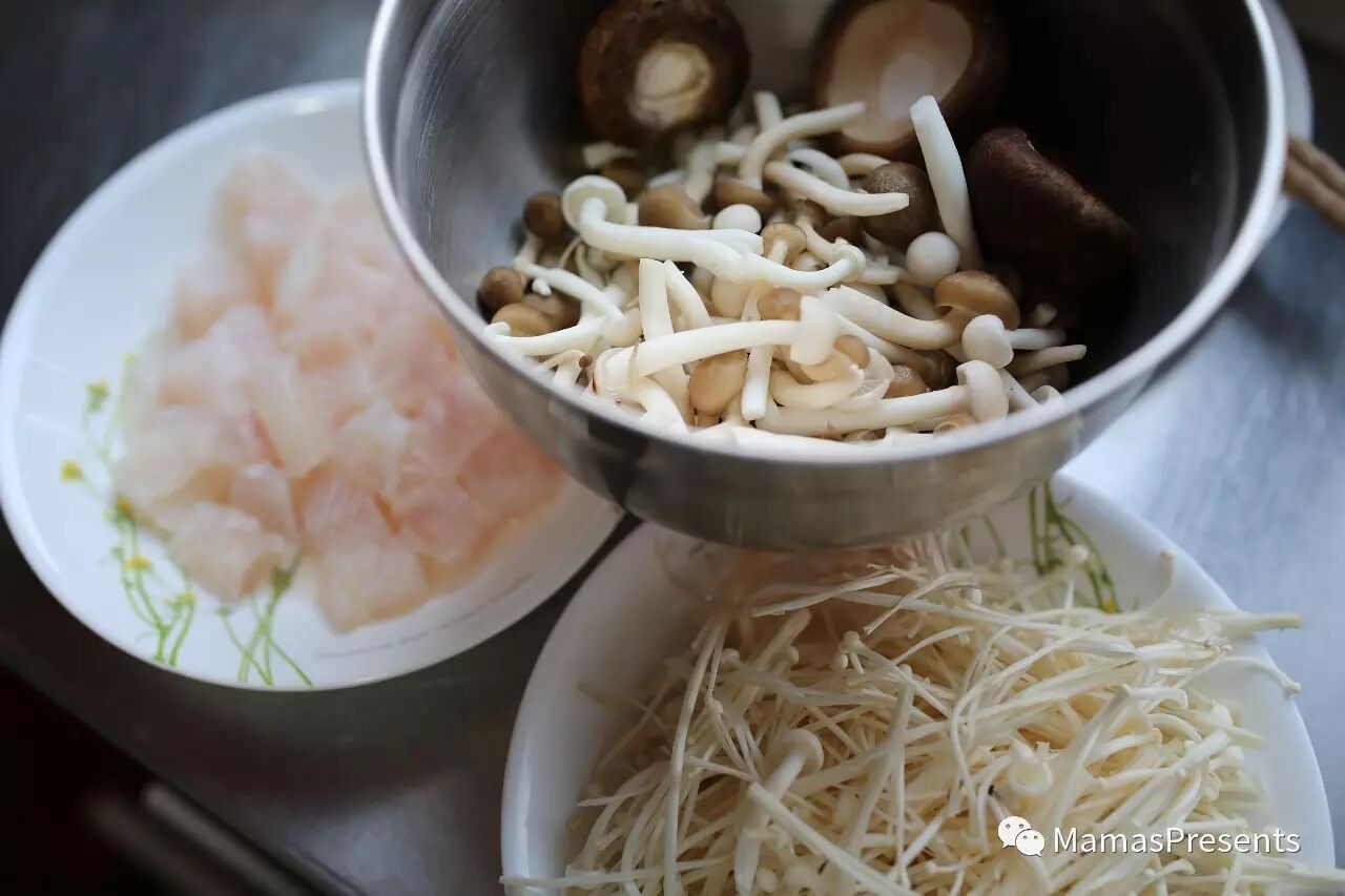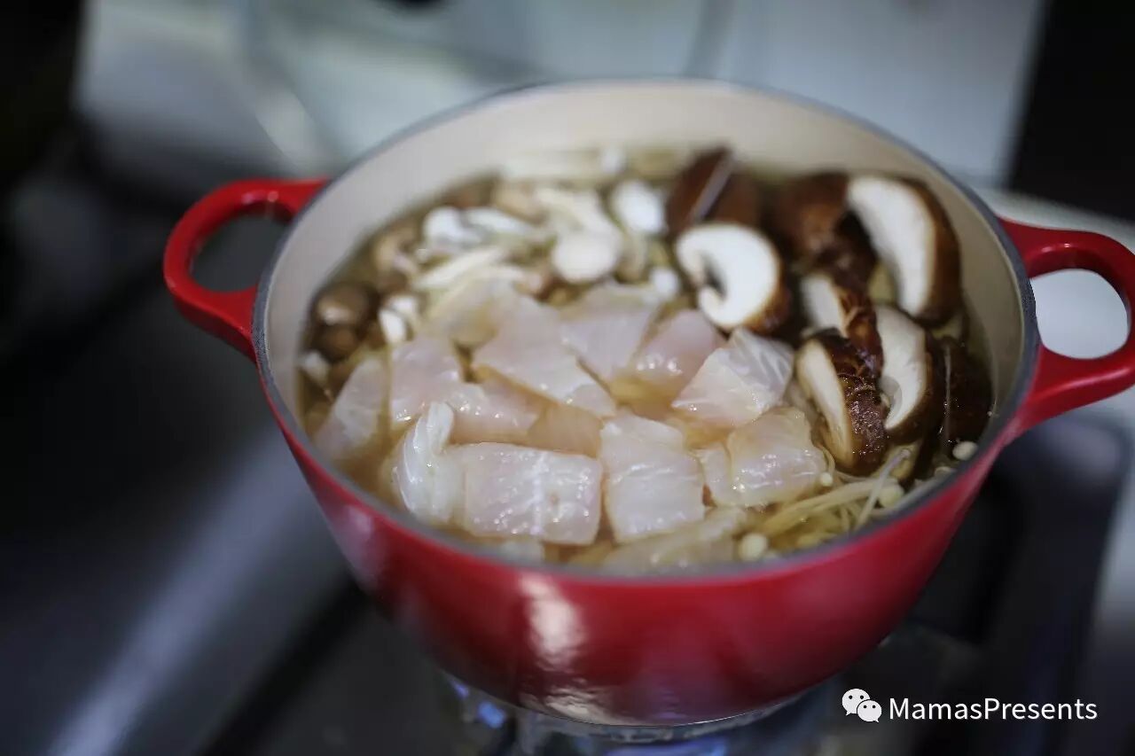 4、蘑菇依次放入锅中,将腌制好的鱼块下入锅中,开锅后放入盐调味即可