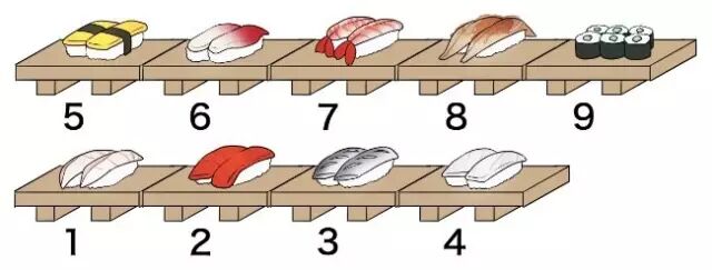 一盘寿司摆在你面前,从哪个开始吃?就生鱼片寿司来说,从肉偏瘦、颜色偏淡的鱼开始,再渐渐过度到肉肥、颜色深的鱼。