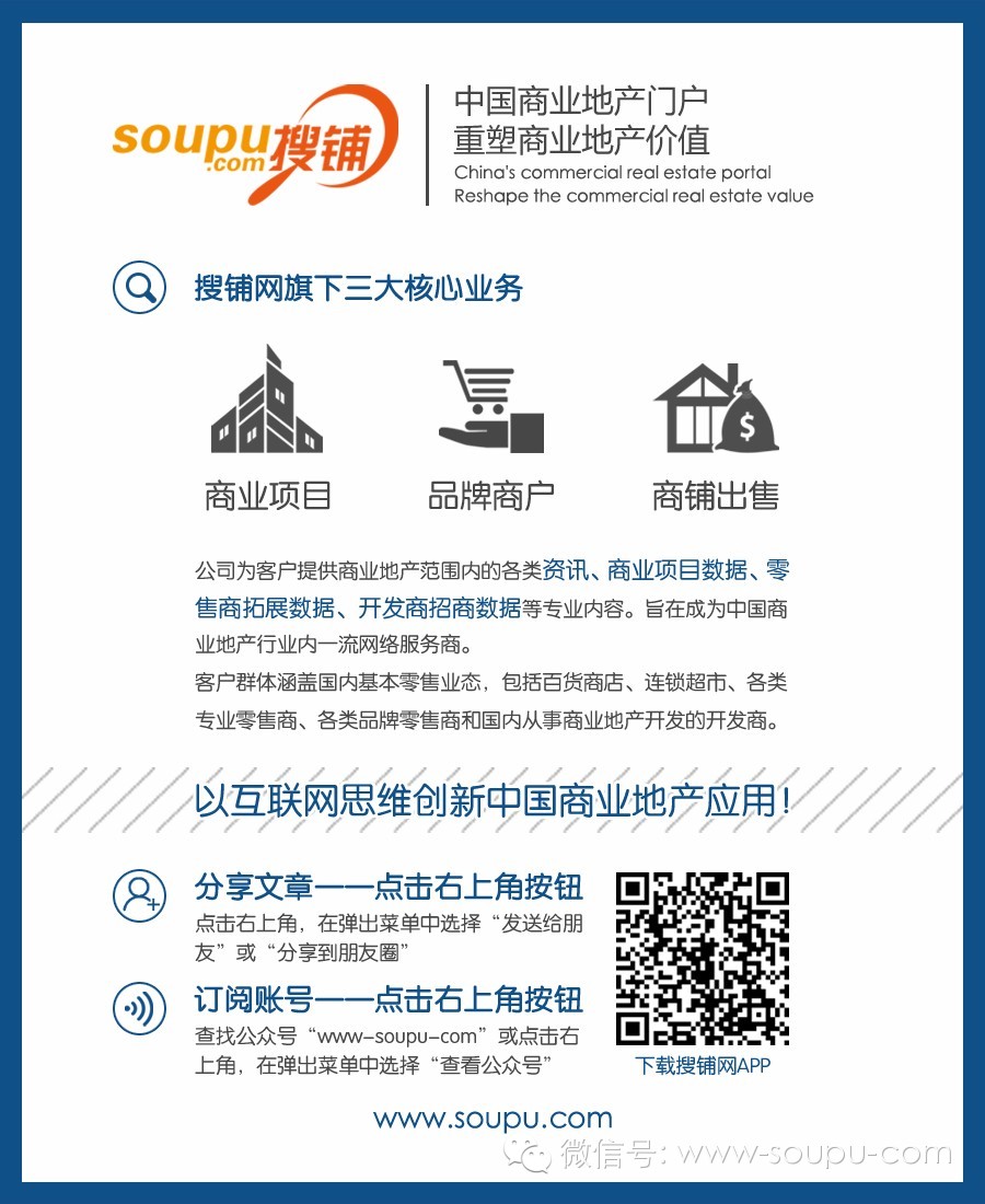 点击上面↑蓝色【搜铺网】小字即可关注我们的微信公众账号,商业地产精品资讯每日放送!